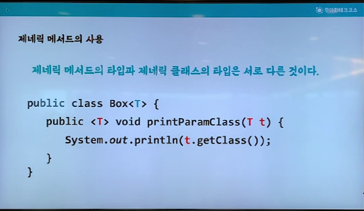 - 제네릭 메서드는 제네릭 클래스가 아닌 일반 클래스에서도 사용 가능하다.