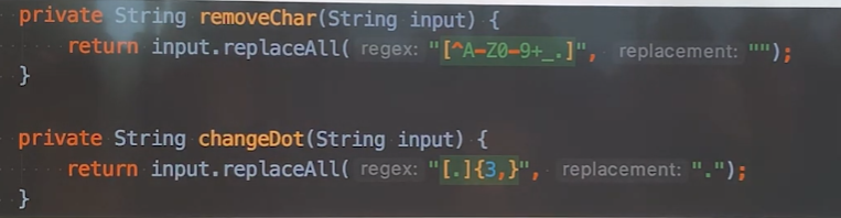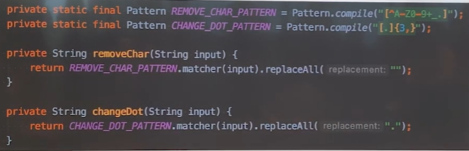여기서 성능상의 이점을 살리기 위해 , String의 replaceAll을 사용할 때, Pattern을 정적으로 만들면 좋음