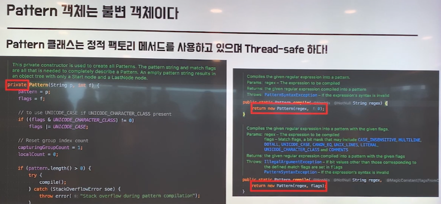 - Thread-safe 하게 사용하려면 Pattern 객체의 matcher()를 통해 Matcher를 생성한 뒤 사용하면 됨