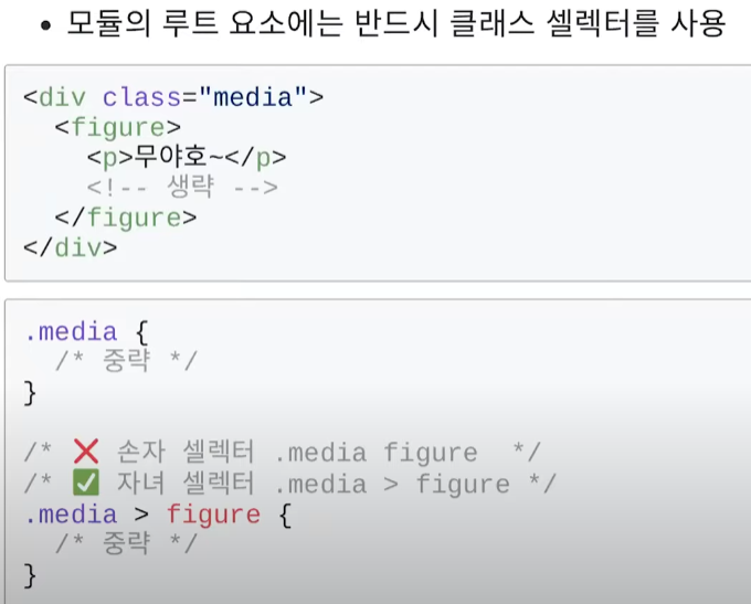 모듈의 하위 요소에는 요소 셀렉터를 사용할 수 있으나, HTML과 스타일링을 느슨하게 결합하기 위해