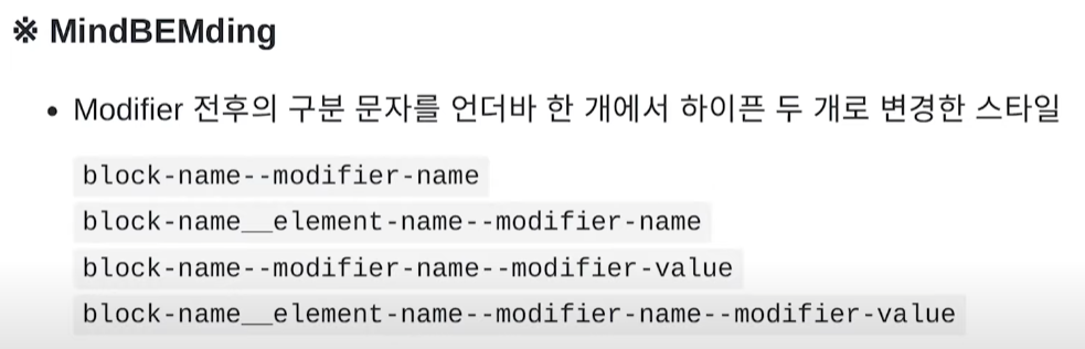 - BEM을 사용할 때는 ID 셀렉터 또는 요소 셀렉터를 사용하면 안됨 -> 클래스셀렉터를 사용