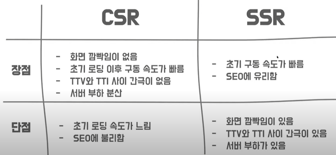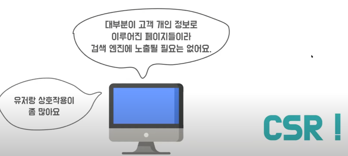 - 초기로딩속도 보완 , SEO 개선 , CSR의 장점 = 최근 많이 사용됨