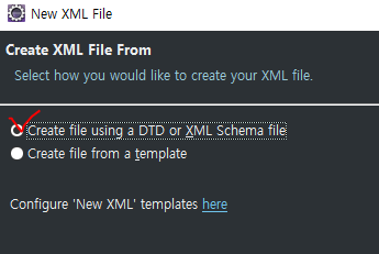 4. 기본적으로 template 파일로 생성에 체크되어있지만, DTD or XML Schema file로 만들기 선택후 Next