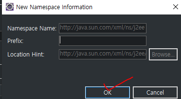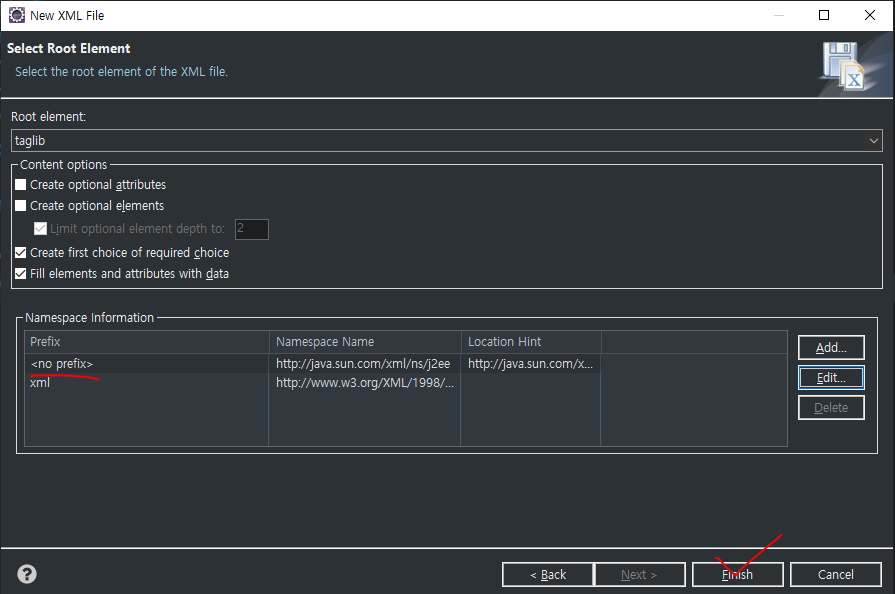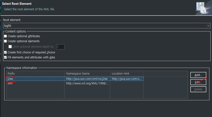 6. 기본적으로 j2ee로 Prefix 되어있는데, 우리는 태그명 또한 바꿀 것이기 때문에 j2ee를 클릭 후 edit을 눌러 값을 지워줌