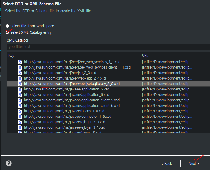 XML tatalog entry 체크 후 java.sun.com /... j2ee / web-jsptaglibary 를 선택 후 Next