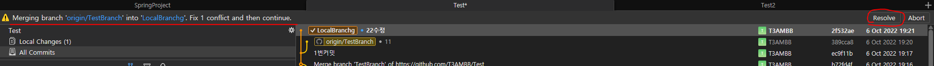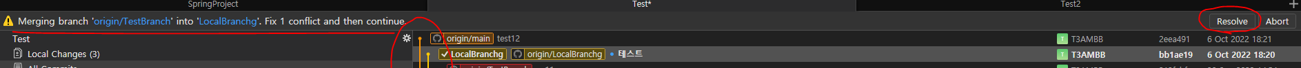 상단에 뜬 경고를 보게되면 barnch를 병합한 후에 진행하라고 합니다. Resolve를 눌러줍니다.