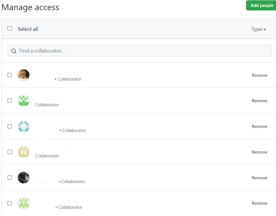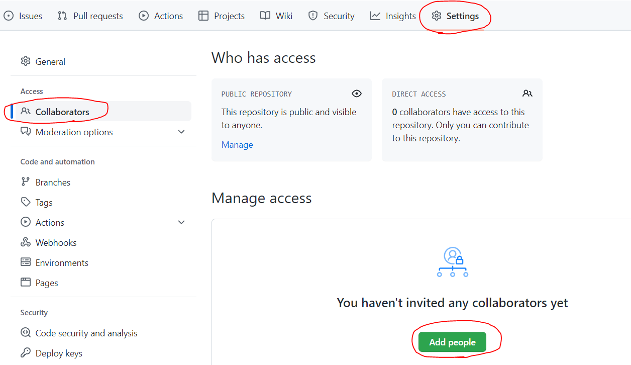 레포지토리 설정에 들어가 Collaborators를 누르게 되면 Add people를 할 수 있습니다