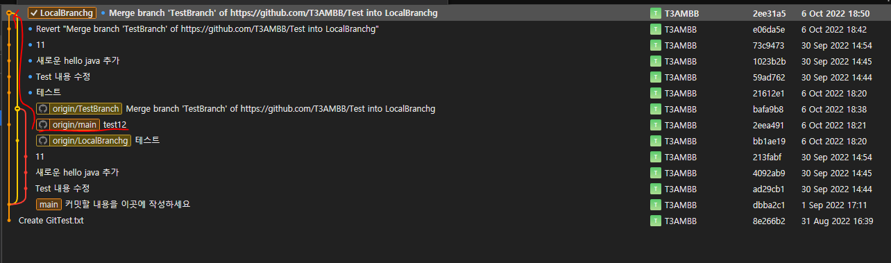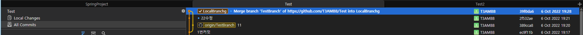merge 및 commit이 정상적으로 이루어진 것을 볼 수 있으며