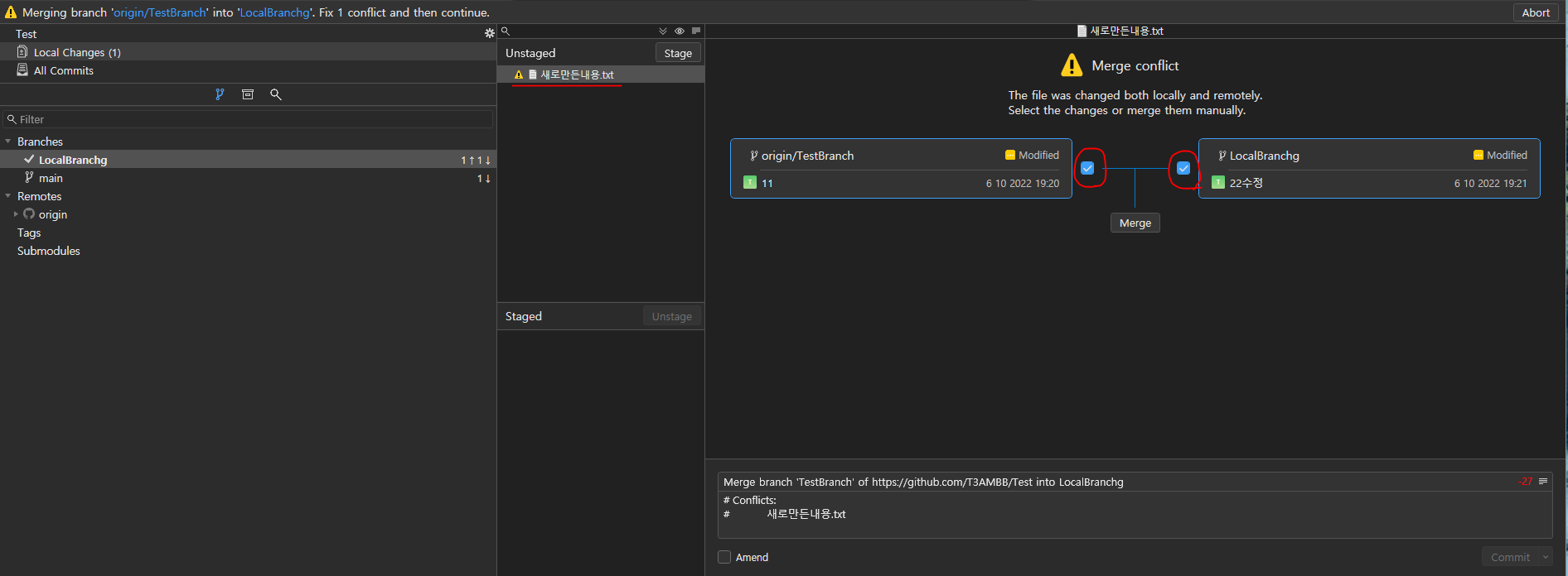 그러면 좌측 unstaged에 어떤 파일이 겹치는지 뜰 것이고,