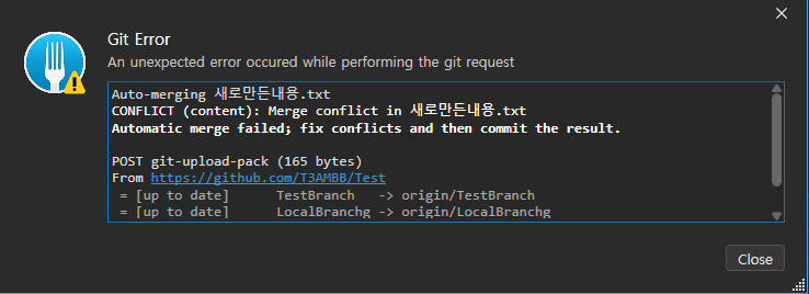 하지만 위에서 말했듯 같은 파일에 대한 commit이 있다면 다음과 같이 pull이 안될 수 있습니다.