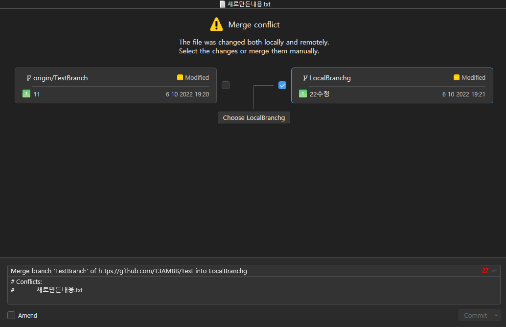 22 수정이 이루어진 Choose LocalBranchg를 클릭 후 commit 하겠습니다.