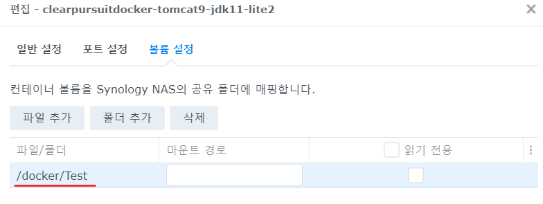 파일/폴더에 내 공유폴더인 docker/Test 경로에 있는 파일들을 base로 지정한 설정이 만들어진다.