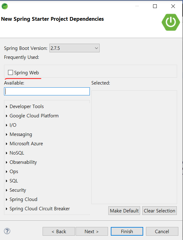 현재 dependency로 Spring Web 즉 내장 톰캣을 사용하려 하는데