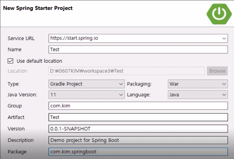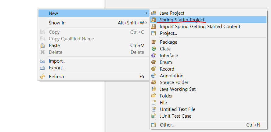 그 후, Spring Starter Project로 새로운 프로젝트 생성