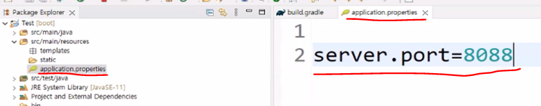 다음과 같이 server.port=8088 이라고 작성하게 되면 내장톰캣의 포트번호는 8088로 인식되게 된다.