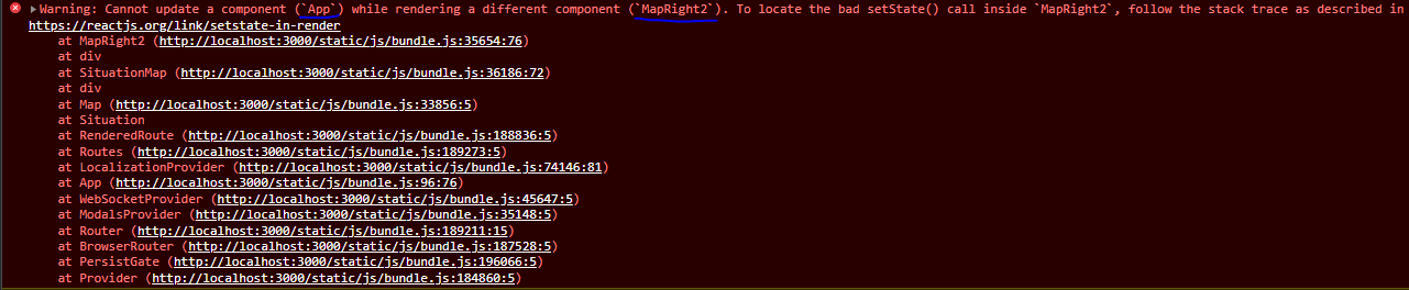 이유로는 'MapRight2' 컴포넌트가 렌더링 되는 동안에 'App' 컴포넌트 상태를 업데이트 할 수 없기 때문이라고 한다..