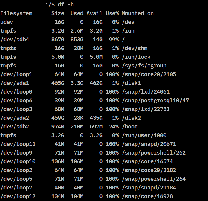 df -h 명령어로 확인해보니 , 기본으로 마운트 되어있는 sdb4 같은 경우 99% 를 사용하고 있어 ,