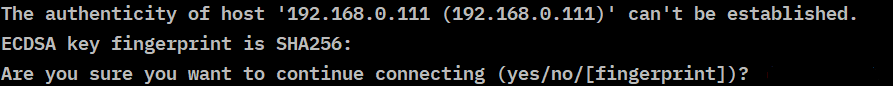 보안상의 이유로 SSH가 호스트의 신원을 확인하려고 뜨는 것인데, yes를 타입하고 엔터를 누르면