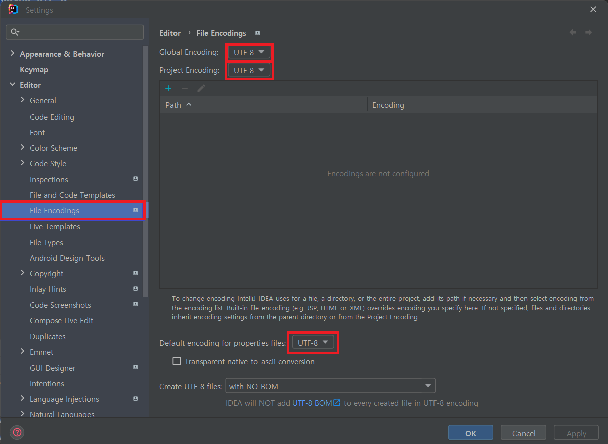 이렇게 인텔리제이 자체 Settings에 인코딩을 변경도 해보았지만 여전히