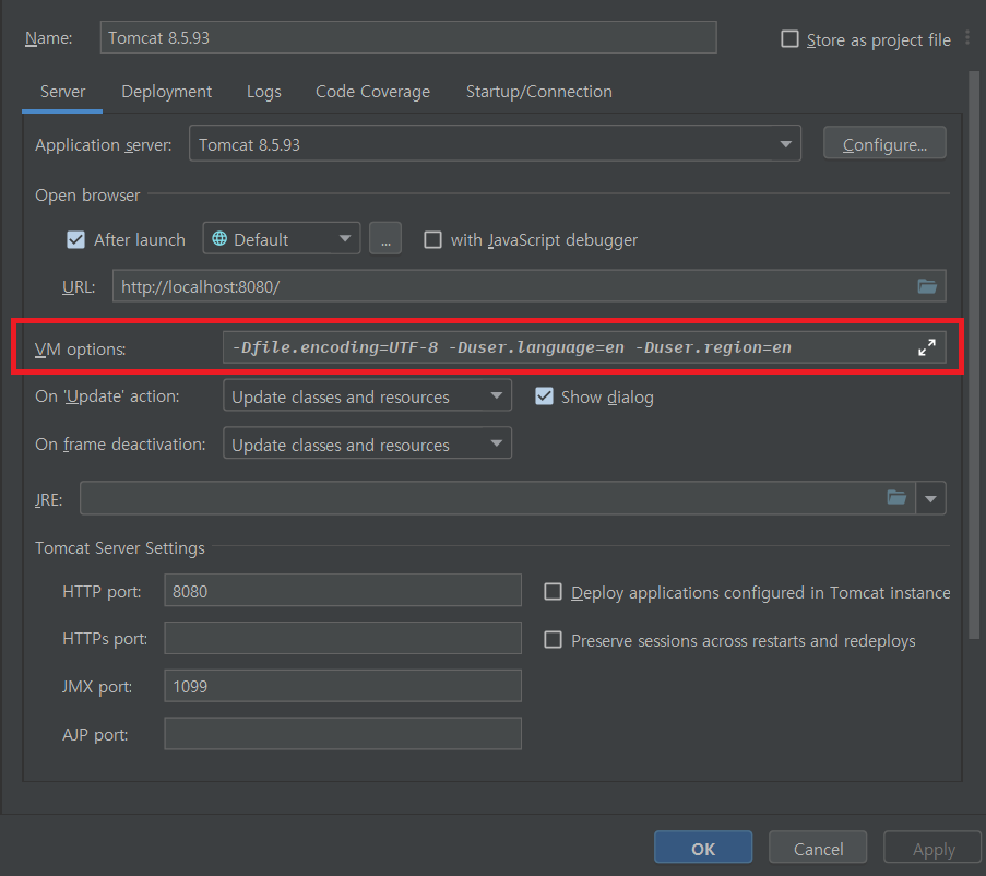 그래서 추가로 언어랑 위치를 VM options에 추가했다.