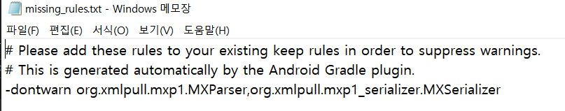 위 방법으로도 해결이 안되면, 오류 내용을 보면 app\build\outputs\mapping\release\missing_rules.txt 경로에있는 파일을 확인하라고 하는데, 그 txt 파일을 열어보면 추가적으로 등록 되어야 할 룰들을 안내해준다.