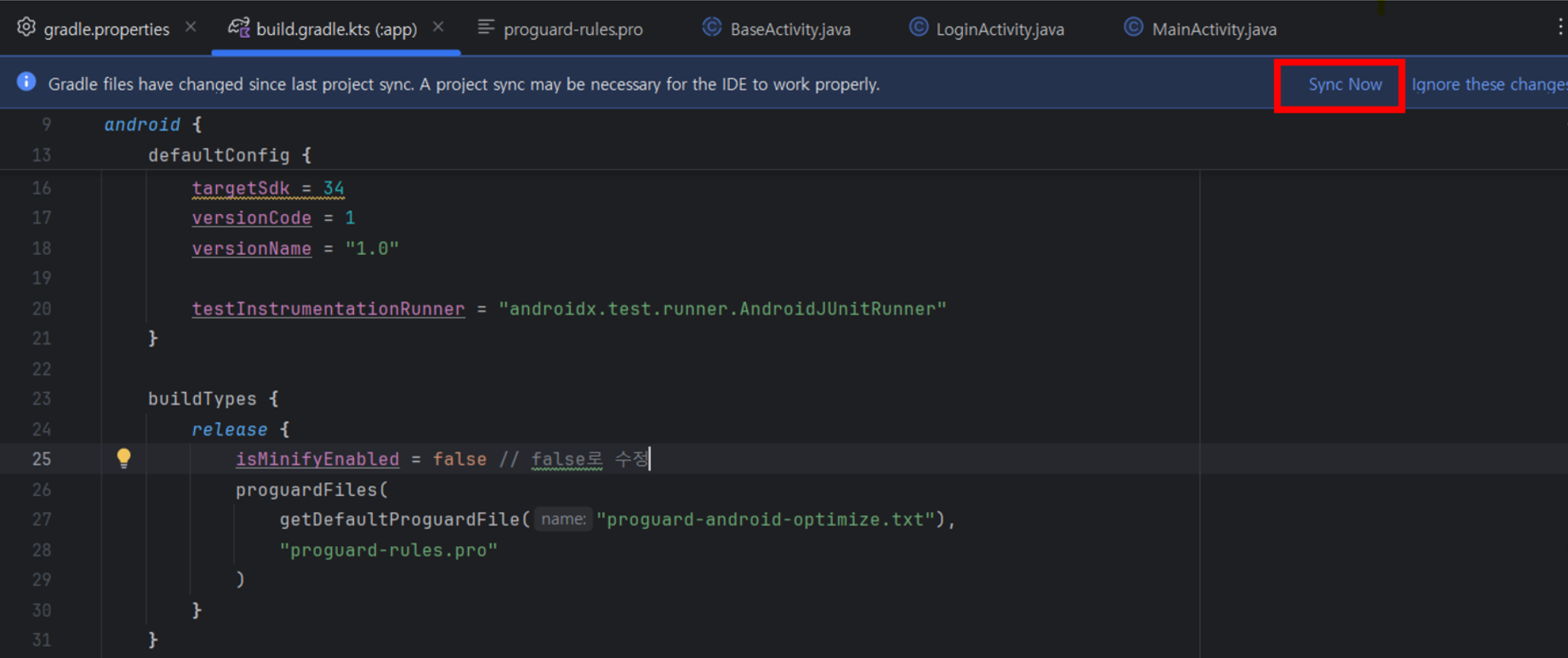 isMinifyEnabled = false // 해당 부분이 true로 되어있을 건데, false로 수정