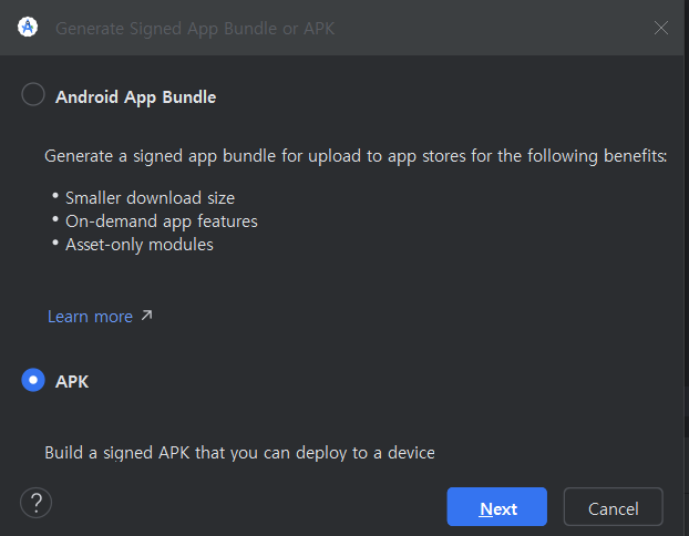 APK 파일로 추출을 하기 위해서 APK를 선택한 후 Next