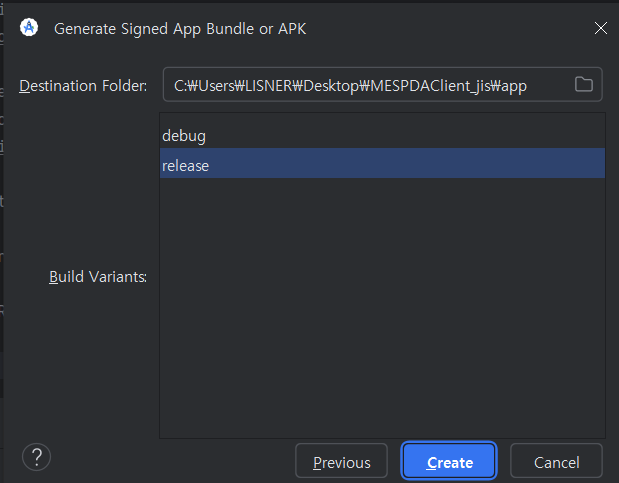 Create 하면 APK 파일이 소스폴더\app\release 경로에 생성된다.
