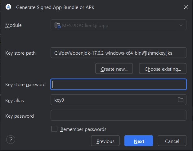 이 때, 키는 추후 어플리케이션 버전 관리에 필요하다고 하니 백업이나 비밀번호 등을 잘 기억하자