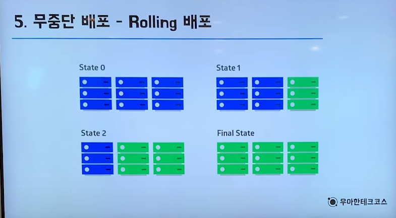 단점) - 배포할 서버가 너무 많다면 n대 단위로 배포하기도 하는데 배포가 모두 끝나기 전까지는 누구는 이전 서비스를 받고 누구는 신규 서비스를 받을 수 있다는 문제가 존재한다.