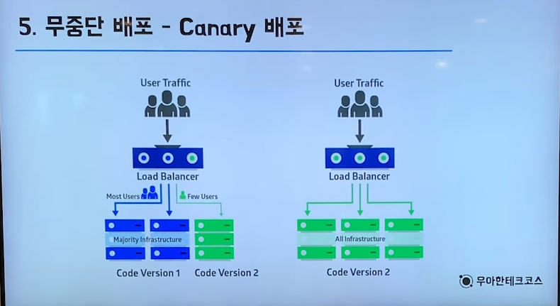 - 소수의 유저(혹은 사내)만 사용하는 환경(Canary 환경)에 신규 버전을 배포하고 문제가 ㅇ벗다고 판단됐을 때 다른 모든 서버에 배포한다.