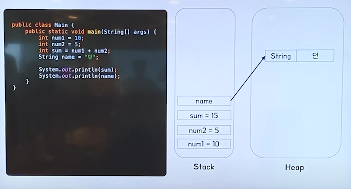 원시 타입의 데이터가 값과 함께 할당. Heap영역에 생선된 Object 타입의 데이터의 참조 값 할당.