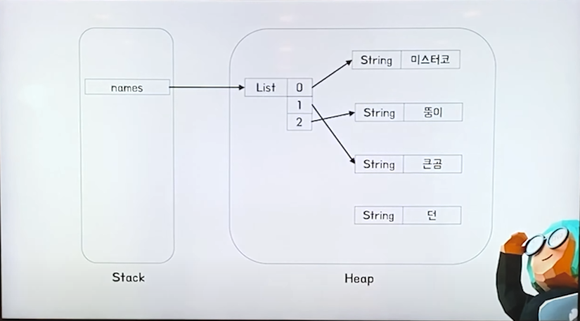 모든 Object 타입의 데이터가 할당. Heap영역의 Object를 가르키는 참조 변수가 Stcak에 할당.