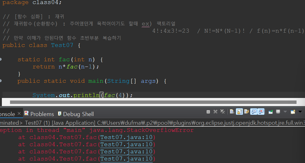 return n * fac(n - 1); // return에 포함되있는 fac(n-1)에 대한걸 모르니까 계속해서 n*fac(n-1)을 반복하다 보니 메모리 부족..
